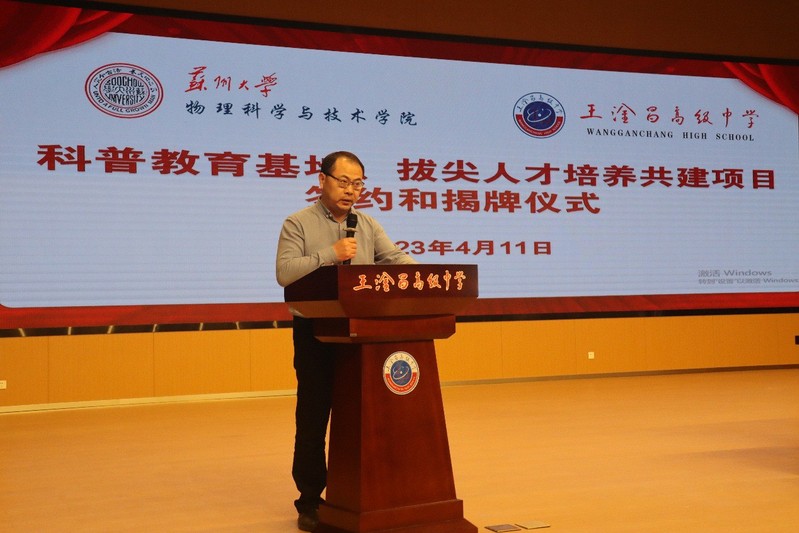 范祖国校长代表常熟市王淦昌高级中学对各位领导、老师和同学们的到来表示热烈欢迎。常熟市王淦昌高级中学高度重视“科技教育”品牌和学科基地建设,秉承“承淦昌精神,育时代新人”的办学理念,通过“走出去,引进来”的方式,不断深化基础学科拔尖人才培养模式改革,推动学校跨越式发展、高质量发展。他指出,此次科普教育基地、拔尖人才培养共建项目的签约与揭牌,能激发同学们热爱科学的信心,助力学校科学教育再向新台阶,培养具有王淦昌精神气质的时代新人。