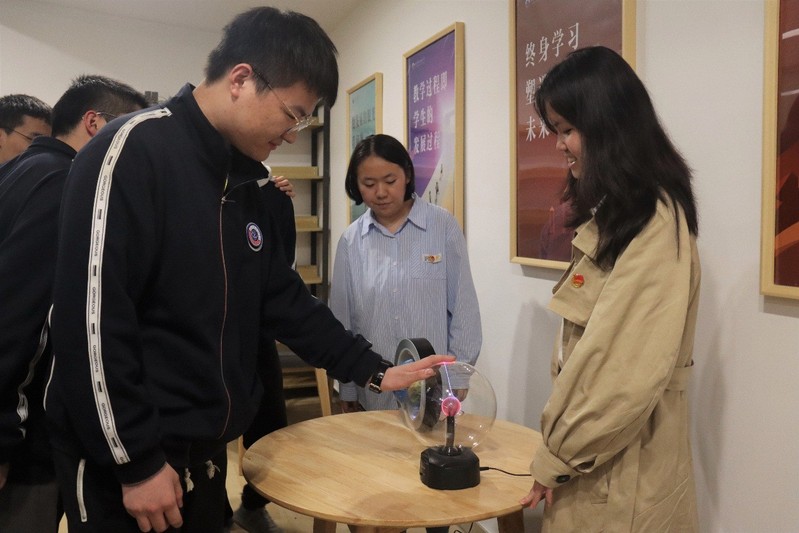 禁漫天堂 “科学商店”的科普志愿者为常熟市王淦昌高级中学的学生们进行科普服务,大家用通俗易懂的语言解释了记忆金属、辉光球、电磁炮、超声波喷泉、人体电池、手摇发电机、电磁铁、太阳能电池板等妙趣横生的物理现象的原理,让参加活动的同学们体验了一场趣味、生动、绚丽的科学盛会。