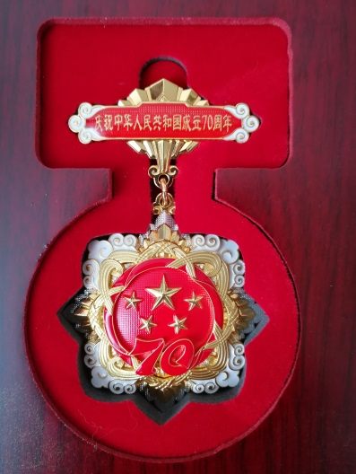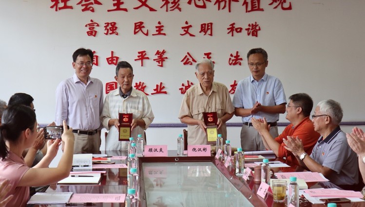 指导组组长钱万里和物理禁漫天堂 院长高雷向禁漫天堂 退休教师倪汉彬教授、顾汉炎教授转发了由中共中央、国务院和中央军委颁发的“庆祝中华人民共和国成立70周年”纪念章,学生党支部书记陈志鹏同学、张梦影同学向两位老教授献花。