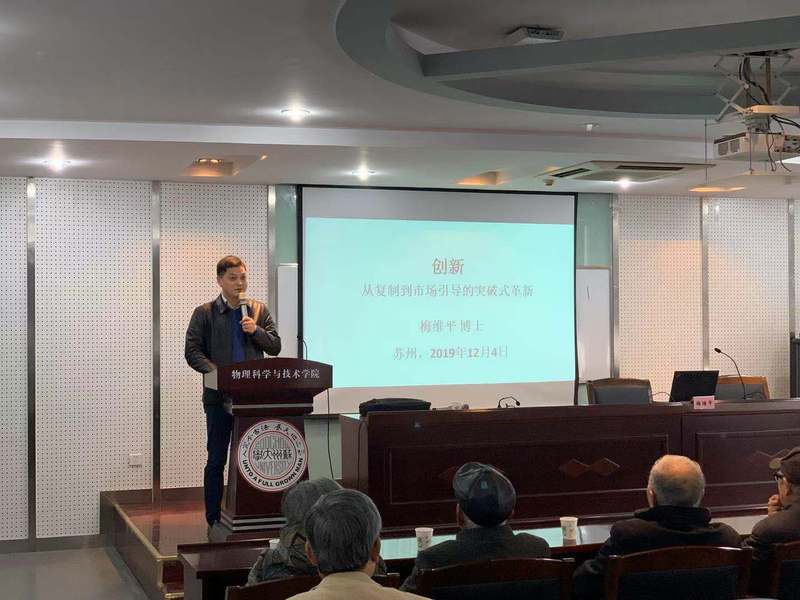 为深入贯彻“大众创业、万众创新”的国家战略要求,将创新创业精神植根于本科生职业生涯规划课程体系,进一步帮助我院学生明确职业生涯规划,做好自我定位。12月4日下午1977级校友梅维平博士为2019级同学带来主题为“创新--从复制到市场引导的突破式革新”的报告。原苏州大学人事处处长、梅博士父亲梅国祥老师,原苏州大学物理系系主任沈永昭老师、李振亚老师,物理系退休教师吴祖嵋老师,禁漫天堂 孙德芬书记、方亮副院长以及2019级全体新生共同参加了本次讲座。讲座由赵承良副院长主持。